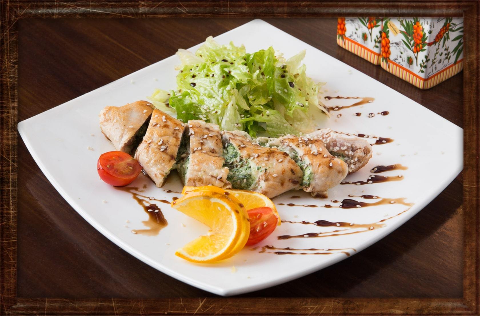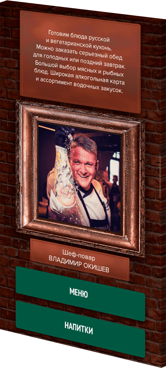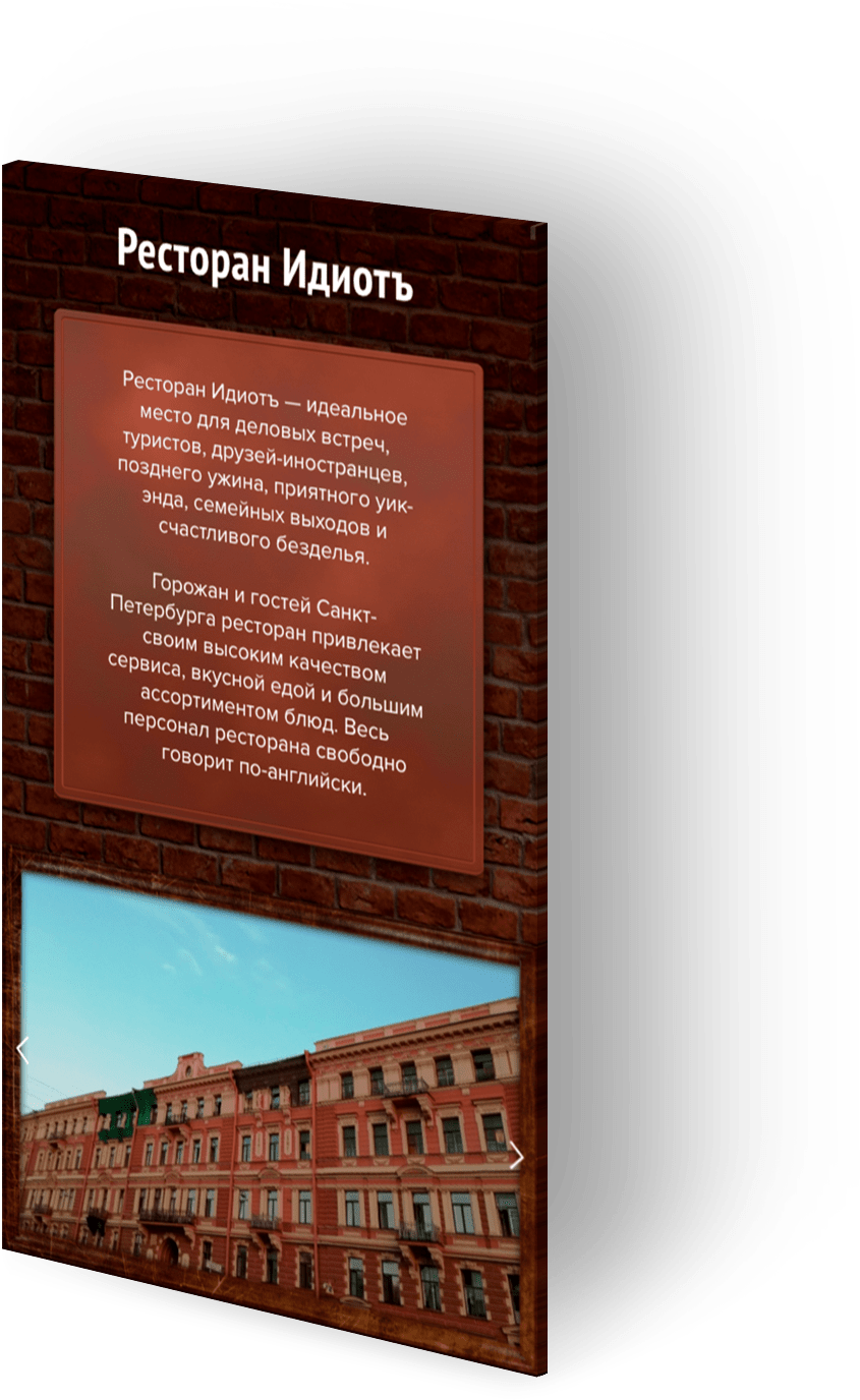 Основой дизайн-решения является интерьер самого ресторана, где основным фоном сайта являются кирпичные стены, винтажные рамки, мебель и др.
