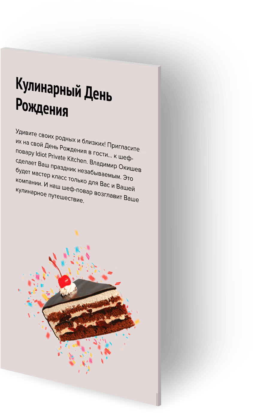 Задача. Разработать сайт для кулинарного проекта, основными услугами которого являются мастер-классы, проведение дней рождения, девичников и корпоративов.